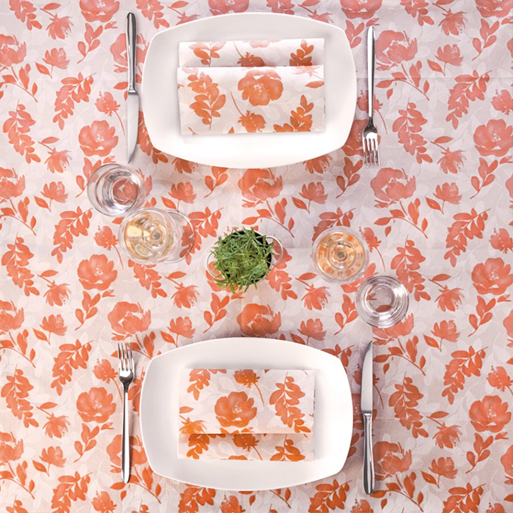 Crafted from premium airlaid paper, this tablecloth combines the look and feel of linen with the ease of single use. With soft white backing and delicate orange floral prints, it’s an instant way to brighten up any tablescape.
